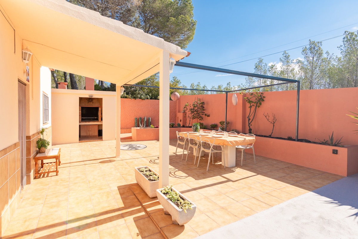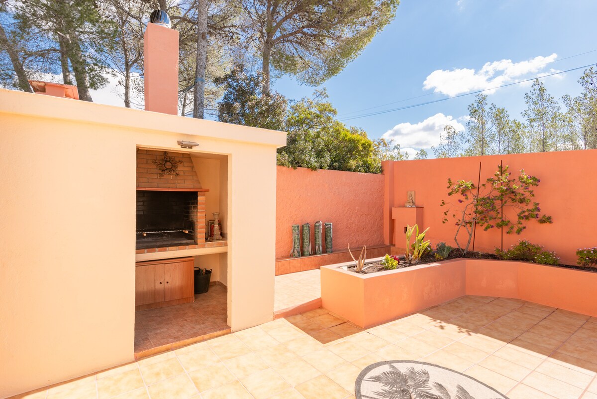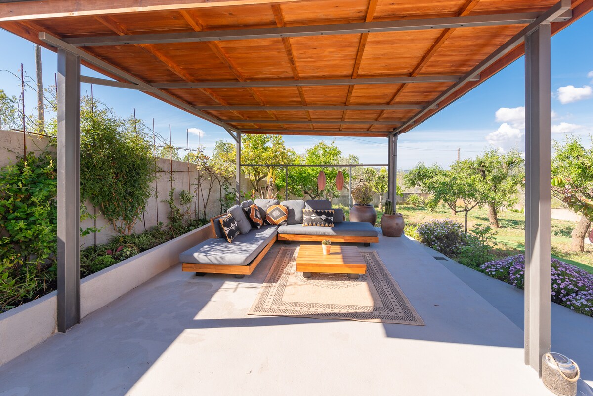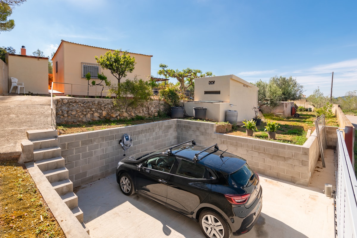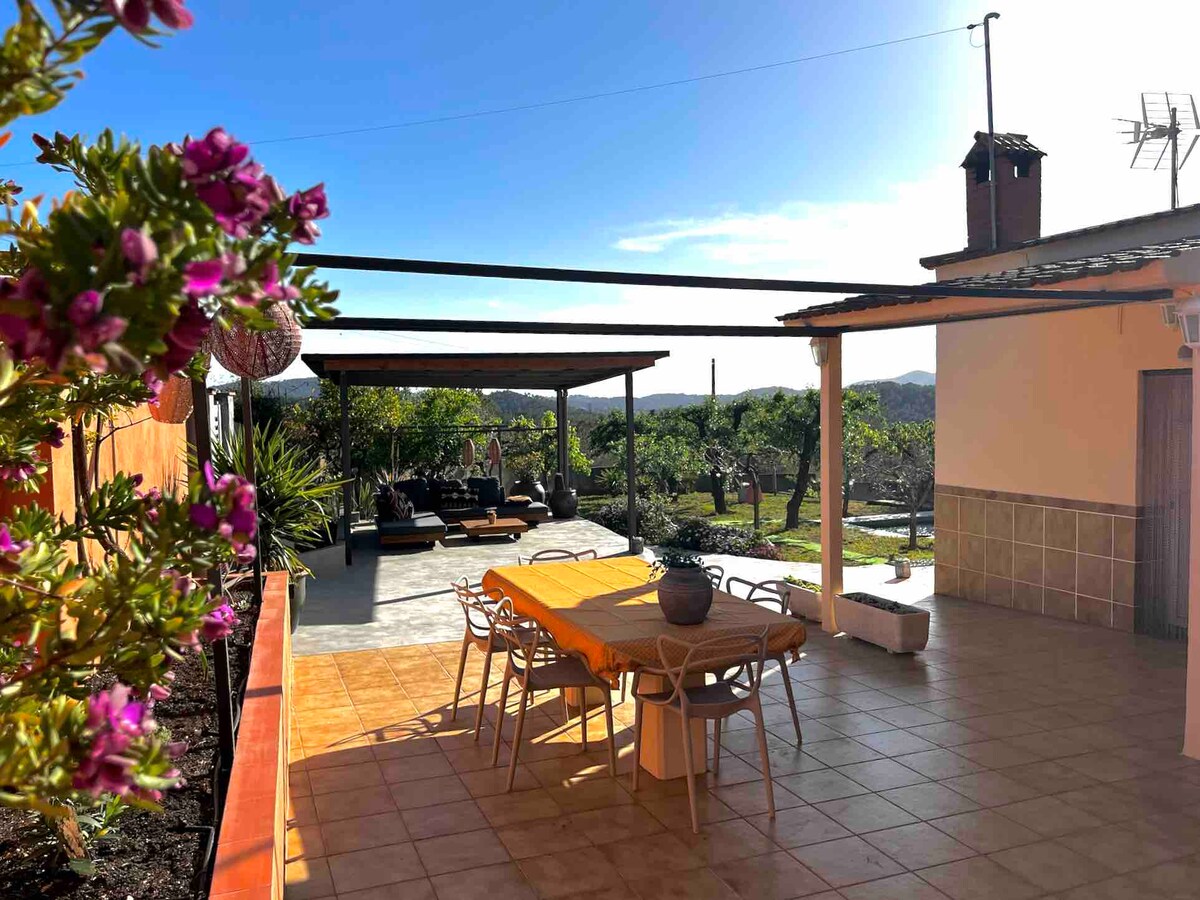 Enjoy the tranquility of our small house (with airconditioning and WiFi) with a lush garden boasting fruit trees, a chill-out area, and a covered barbecue space with a secondary kitchen.